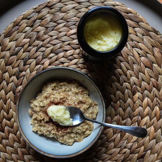Add 1 tsp of Ghruta ghee to your tea or coffee for better metabolism, mental focus, and energy. Add Ghruta and Bamboo Salt to your meals to improve food assimilation and to nourish and support the body, mind, and nervous system. Take targeted supplementation of supernutrient botanicals for hair, skin, mind, and digestion.